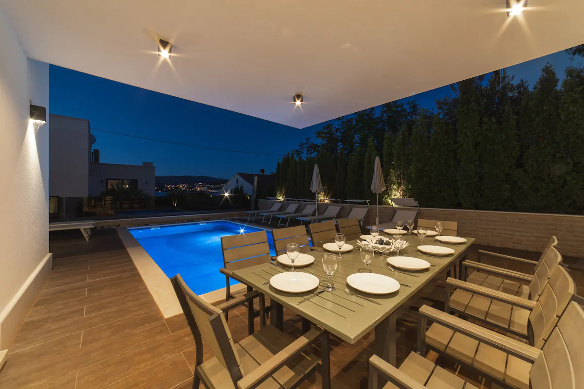 Villa Sun is located in Čiovo area directly next to a lovely pebble beach. Our villa is fully equipped and designed for a pleasant stay with family & friends. From the pool terrace there is a beautiful panoramic view of the sea, Trogir and the mountains. Spend your vacation in a home that will give you complete comfort and unforgettable holidays and relaxation. Visit the Split city which offers many opportunities during the summer and offers various events that will complement your vacation.